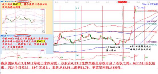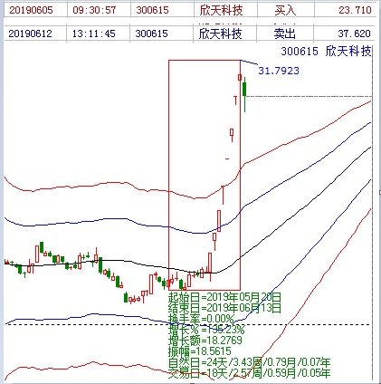 接下來介紹下近期的牛股欣天科技(300615),這是一個(gè)翻倍股,贏家團(tuán)隊(duì)是在5月20日篩選出來跟蹤的,該股在6月3日漲停突破生命線開啟了連板之路,6月13日連板結(jié)束。共24個(gè)自然日,18個(gè)交易日,股價(jià)從13.51上漲到31.79,單波空間高達(dá)135%。