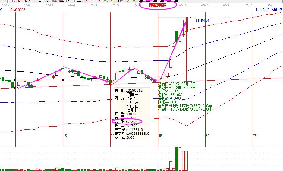 和而泰,贏家江恩于7號提前選出在自選,并提前預測分析未來時間窗在9號、12號,江恩認為時間是決定市場走勢最重要的因素,因此,9號、12號就是也給重要的變盤點,如果想要交易,就要重點關注這個時間節點。再看價格,7號給出關注點位8.8-9.10,在9號、12號,個股回落趨勢線支撐8.73,基本上與給出的關注點位8.8高度一致,時間和價格形成共振,合力促使轉勢行情。開啟一波牛市上漲行情,從時間窗12號至23號收盤,10個交易日,漲幅55%,這就是江恩的神奇。