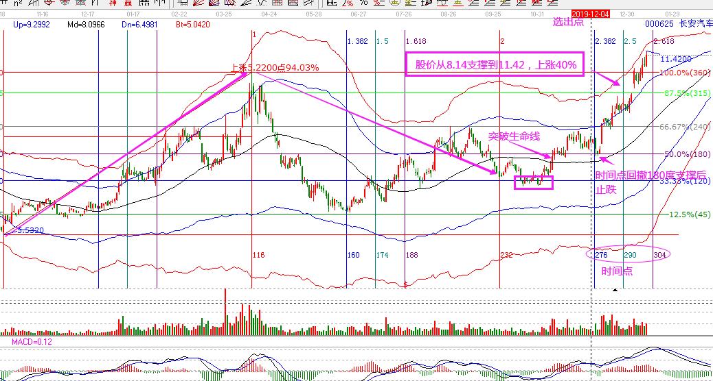 長安汽車,是在2019年12月4日選出,理由是:股價處于生命線上強勢區域,價格在江恩180度重要支撐附近,12月6日為時間窗口。同時,市場整體處于非下跌周期中。股價在時間窗口回撤江恩180度及生命線支撐,構成了最佳買點,12月11日股價突破240度阻力,向上打開新的空間,市場沿著藍色線向上運行,目前已經運行到紅色線附近,從選出到今天,按照規則操作持股,這波的盈利空間超過40%。