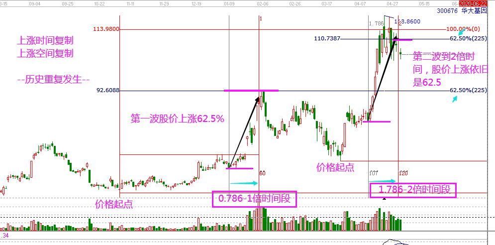 經過詳細的研究,我們發現股價從11月1日56.99上漲到2月4日(1倍時間窗口)高點,股價上漲幅度62.5%;股價從3月24日上漲到4月29日(2倍時間窗口),股價上漲幅度62.5%。時間上,4月10日(0.786倍時間窗口)上漲到4月29日完美復制1月8日(1.786倍時間窗口)上漲到2月4日。我們可以發現,市場在復制前一周期階段的時間和空間。這是一種非常完美的市場行為。