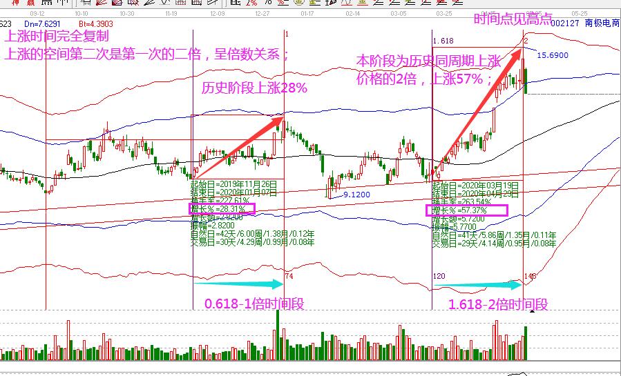 南極電商的時空走勢更是接近于完美復制,時間上0.618倍時間上漲到1倍時間窗口,股價上漲28.3%;1.618倍時間上漲到2倍時間窗口,股價上漲57.3%,接近2倍,這是江恩所強調的倍數關系。我們發現市場完美的復制歷史上漲的時間,而空間則是倍數關系。