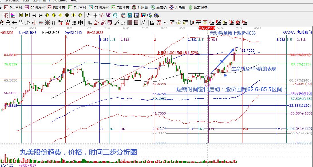 4月3日,股價處于生命線上強勢區域,趨勢上支持買入;價格處于江恩315度之上,支撐上符合買入條件,股價的上漲空間按照規則看高前期高點及藍色線。時間周期這塊,費氏時間第21天,股價上漲突破了315度,懂贏家的朋友應該明白,這是一個強勢二買模型。事實上,股價在生命線和315度共振支撐上連續反彈,逐步創出了新高并突破了藍色線。