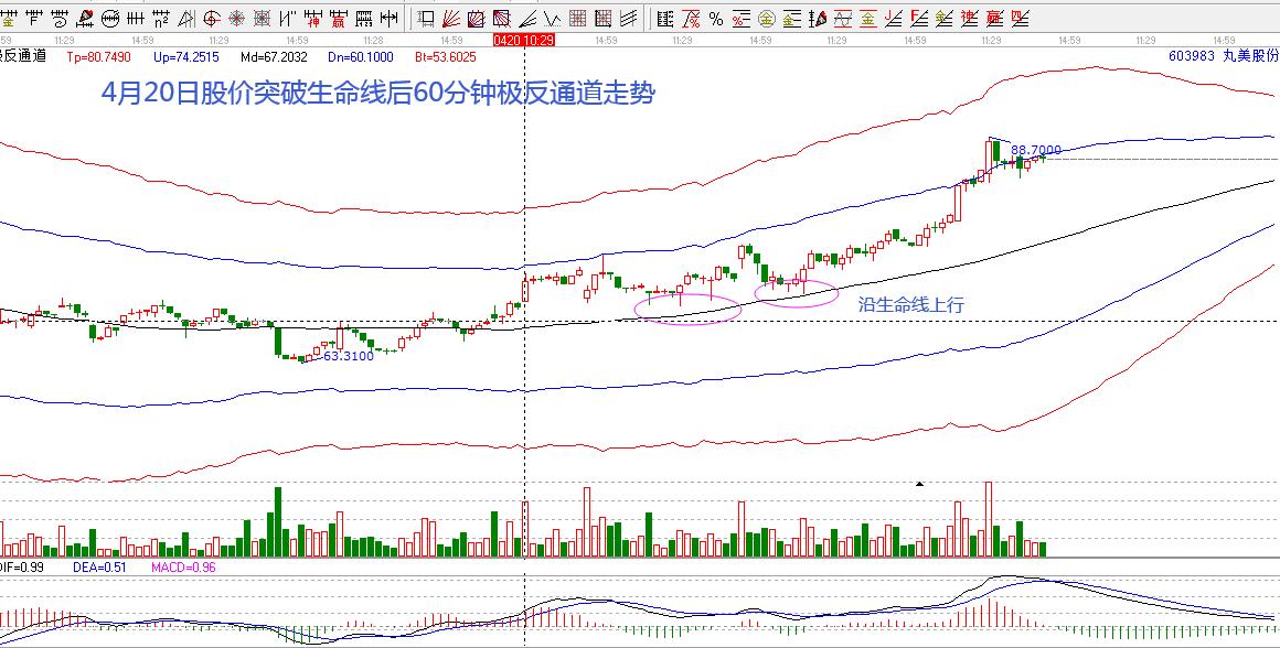 股價的上漲階段,筆者調整了價格分析圖,將波段百分比調整為波段百分比延伸線,同時,在震蕩階段所需關注的60分鐘級別極反通道走勢給大家做個展示,我們知道趨勢行情下60分鐘生命線是做趨勢跟蹤的關鍵位,因為強勢上漲階段股價不會跌破此位置,甚至跌破之后也可以快速收回。