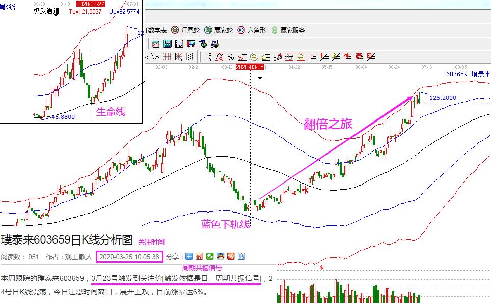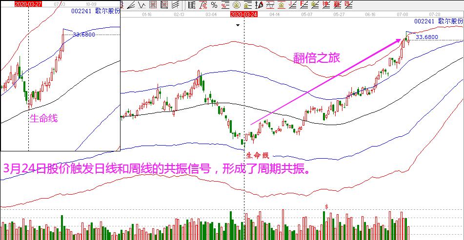 璞泰來和歌爾股份:這兩個票都是在3月底關注的,隨著大盤的一波下跌,不少績優股也給出了更好的位置,其中,璞泰來在3月23日股價日線下跌至藍色下軌線附近,同時周線回踩到生命線,形成了超跌+最佳的周期共振信號;歌爾股份在3月24日股價下跌至藍色下軌線附近,同時周線回踩到生命線,同樣形成了超跌+最佳的周期共振信號。這兩個股票隨后都是展開了翻倍的行情,也都是非常經典的周期共振的左側交易買入案例。