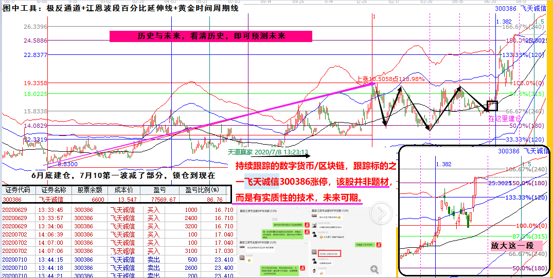 回顧總結學習該股的選出依據及操作信號,歷史前一波的上漲作為起始因子,那么未來的走勢江恩時空線幫你提前顯現!遵循江恩所言,精進研究歷史,即可掌控未來!飛天誠信同步6月底建倉,7月10日第一波高點減倉,剩下的鎖倉至今,單只個股利潤逼近8萬元,盈利超80%,這就是波段交易的魅力,你看懂了嗎?
