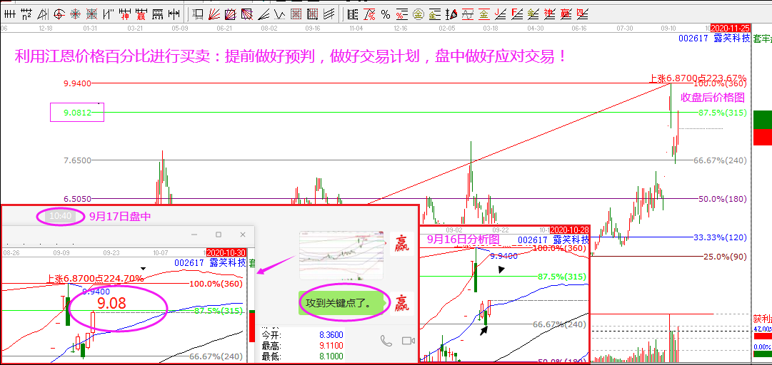技術(shù)分析研究的是市場(chǎng)行為規(guī)律,分析的核心是量?jī)r(jià)時(shí)空4個(gè)基本要素,其中時(shí)間是最關(guān)鍵因素。時(shí)間分析可以確定市場(chǎng)所處的階段是漲還是跌,以及未來的價(jià)格運(yùn)行結(jié)構(gòu)。因此,在股價(jià)進(jìn)入調(diào)整周期之后,下跌就是主旋律。而在這個(gè)過程中,結(jié)合價(jià)格工具尋找賣點(diǎn)則是唯一選擇。在高點(diǎn)確立以后,賣出的位置可以通過江恩工具進(jìn)行預(yù)判,常見的次級(jí)別高點(diǎn)通常會(huì)出現(xiàn)在價(jià)格的315度,極反通道的紅色線或者藍(lán)色線附近。圖中的雙星新材,股價(jià)在紅色線見高點(diǎn)后,按照規(guī)則,跌破藍(lán)色線反抽不上,則要回落生命線。其價(jià)格315度為價(jià)格分析的關(guān)鍵點(diǎn),此位置如果跌破,反抽不上很容易形成次高點(diǎn)。對(duì)于這樣的位置,操作上對(duì)應(yīng)的依舊是賣出。同時(shí),預(yù)期調(diào)整的低點(diǎn)則是生命線和240度附近。按照阻力賣出,支撐買入的規(guī)則進(jìn)行操作,極反通道結(jié)合價(jià)格工具完美把握次高點(diǎn)逃頂。