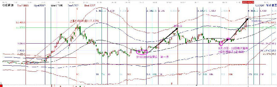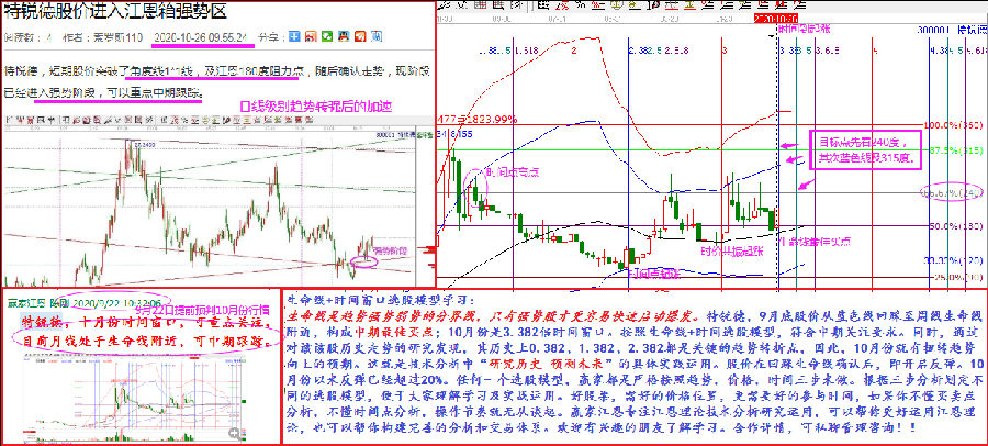 生命線是趨勢強勢弱勢的分界線,只有強勢股才更容易快速啟動爆發。特銳德,9月底股價從藍色線回踩至周線生命線附近,構成中期最佳買點;10月份是3.382倍時間窗口。按照生命線+時間選股模型,符合中期關注要求。同時,通過對該該股歷史走勢的研究發現,其歷史上0.382、1.382、2.382都是關鍵的趨勢轉折點,因此,10月份就有扭轉趨勢向上的預期。這就是技術分析中“研究歷史 預測未來”的具體實踐運用。股價在回踩生命線確認后,即開啟反彈。10月份以來反彈已經超過20%。任何一個選股模型,贏家都是嚴格按照趨勢,價格,時間三步來做。根據三步分析劃定不同的選股模型,便于大家理解學習及實戰運用。好股票,需好的價格位置,更需要好的參與時間,如果你不懂買賣點分析,不懂時間點分析,操作節奏就無從談起。贏家江恩專注江恩理論技術分析研究運用,可以幫你更好運用江恩理論,也可以幫你構建完善的分析和交易體系。