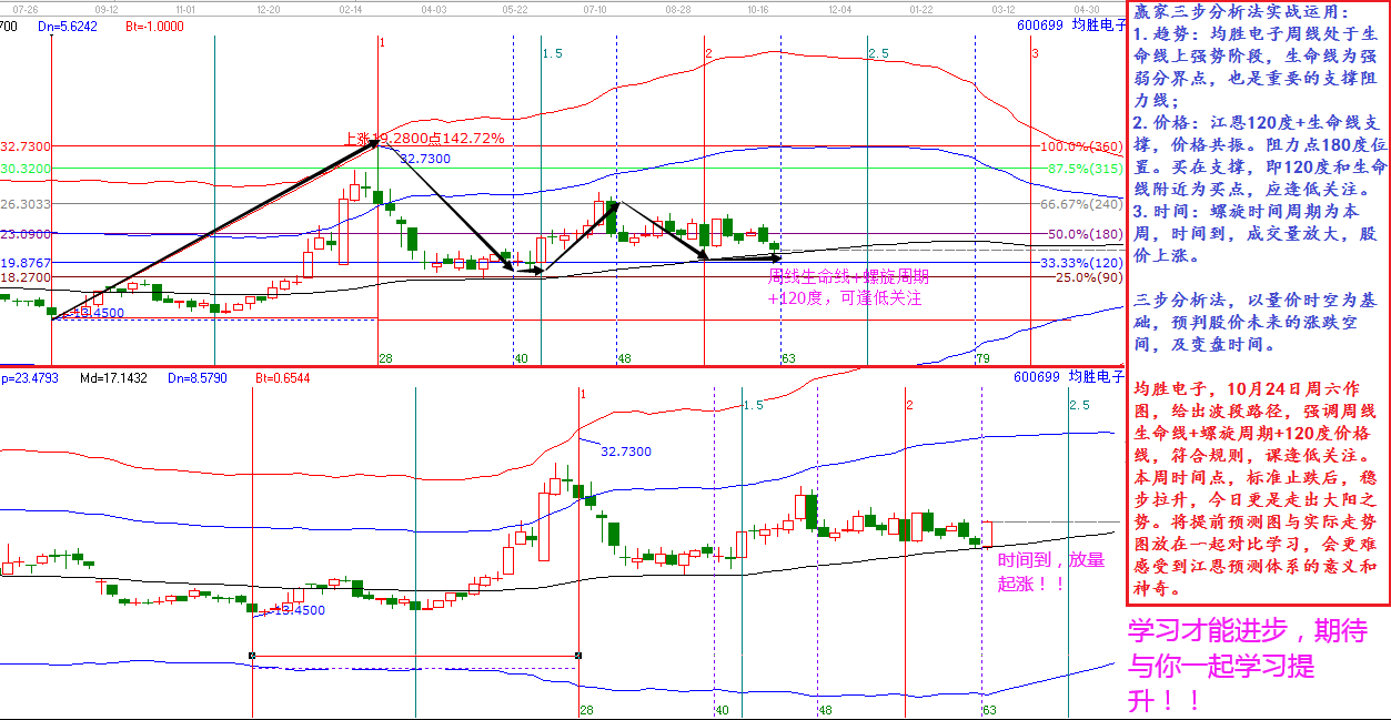 均勝電子,10月24日周六作圖,給出波段路徑,強調周線生命線+螺旋周期+120度價格線,符合規則,課逢低關注。本周時間點,標準止跌后,穩步拉升,今日更是走出大陽之勢。將提前預測圖與實際走勢圖放在一起對比學習,會更難感受到江恩預測體系的意義和神奇。