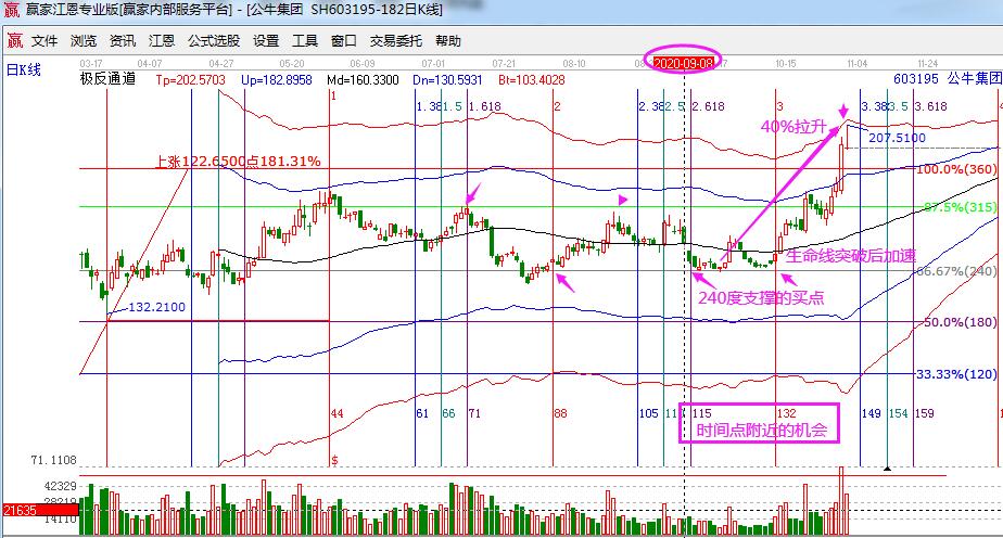 從歷史回顧的角度來說,該股在關注后,9月9日時間點,股價加速回落240度支撐點,并隨后止跌。10月12日開始放量,股價啟動拉升,第二天放量突破生命線進入強勢階段,開始走加速。進入趨勢行情,隨后股價在突破315度之后,直接上攻到極反通道紅色線附近。這一波走勢,從240度支撐點算起,單波盈利空間接近40%。選出后具體的走勢,可以看下圖會有更好的認識。