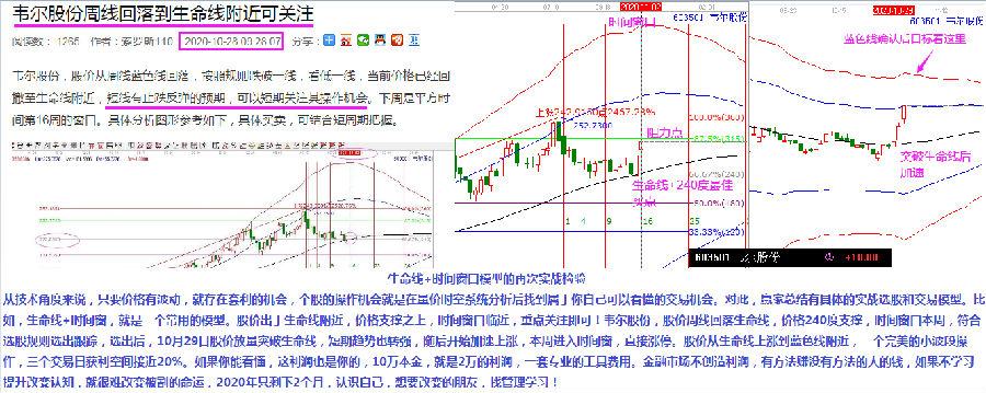 從技術角度來說,只要價格有波動,就存在套利的機會,個股的操作機會就是在量價時空系統分析后找到屬于你自己可以看懂的交易機會。對此,贏家總結有具體的實戰選股和交易模型。比如,生命線+時間窗,就是一個常用的模型。股價出于生命線附近,價格支撐之上,時間窗口臨近,重點關注即可!韋爾股份,股價周線回落生命線,價格240度支撐,時間窗口本周,符合選股規則選出跟蹤,選出后,10月29日股價放量突破生命線,短期趨勢也轉強,隨后開始加速上漲,本周進入時間窗,直接漲停。股價從生命線上漲到藍色線附近,一個完美的小波段操作,三個交易日獲利空間接近20%。如果你能看懂,這利潤也是你的,10萬本金,就是2萬的利潤,一套專業的工具費用。金融市場不創造利潤,有方法賺沒有方法的人的錢,如果不學習提升改變認知,就很難改變被割的命運。