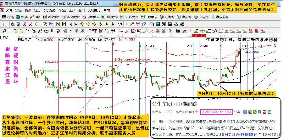 公牛集團,一波趨勢:在預期的時間點(9月9日、10月12日)止跌起漲,從生命線到紅線,一個多月時間,漲幅達35%。自9月8日起,贏家聊吧持續跟進解讀,全部留痕。有圖有依據有分析說明,一起回顧驗證學習,感悟江恩理論神奇的時間魅力!