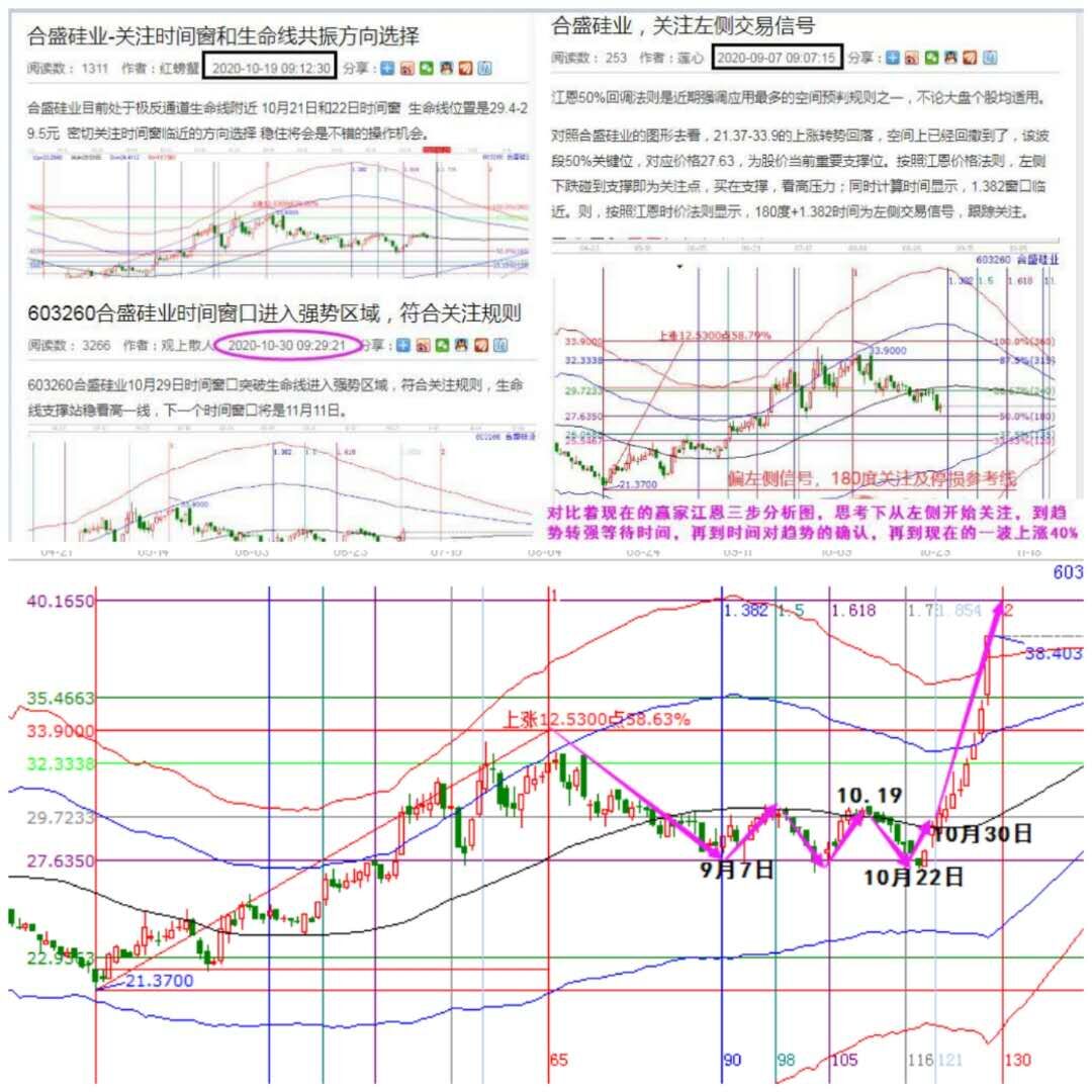 合盛硅業,9月7日剛剛躍過時間就納入關注,10月19日上生命線,但需時間進一步確認;10月30日時間確認生命線后再次明確方向。有在認真關注贏家消息的你,這種股不會錯過。知其然更要知其所以然,沒賺到利潤,也要賺的技術:對比著過去和現在的贏家江恩三步分析圖,思考下從左側開始關注,到趨勢轉強等待時間,再到時間對趨勢的確認,再到現在的一波上漲40%的漲幅??炊?,你就明白贏家江恩交易體系波段操作這么牛。在低位都不愿意看的時候,我們就開始關注,伴隨著信號確認,逐步配置好倉位,當主升開始的時候,就是安安心心吃肉,吃大肉。