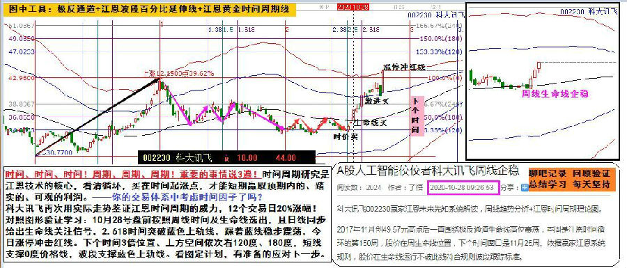 科大訊飛再次用實際走勢鑒證江恩時間周期的威力,12個交易日20%漲幅!對照圖形驗證學習:10月28號盤前按照周線時間及生命線選出,且日線同步給出生命線關注信號,2.618時間突破藍色上軌線,踩著藍線穩步震蕩,今日漲停沖擊紅線。下個時間3倍位置、上方空間依次看120度、180度,短線支撐0度價格線,波段支撐藍色上軌線。看圖定計劃,有準備的應對下一步。