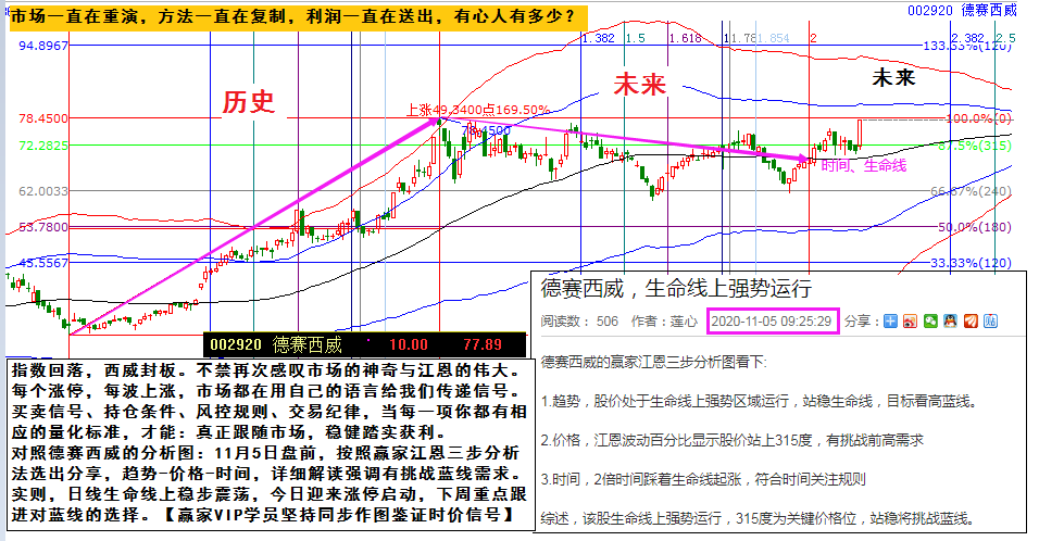 對照德賽西威的分析圖:11月5日盤前,按照贏家江恩三步分析法選出分享,趨勢-價格-時間,詳細解讀強調有挑戰藍線需求。實則,日線生命線上穩步震蕩,今日迎來漲停啟動,下周重點跟進對藍線的選擇。