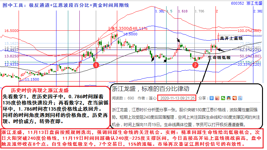 浙江龍盛,11月13日盤前按照規則選出,強調回踩生命線的關注機會。實則:精準回踩生命線給出低吸機會,次日大陽突破240度價格線,11月19日時間回踩確認240度-225度支撐區間,今日直接高開站上藍線挑戰前高,盤中觸及漲停收在8個點。自生命線低吸至今,7個交易日,15%的漲幅。市場再次鑒證江恩時價信號的有效性。