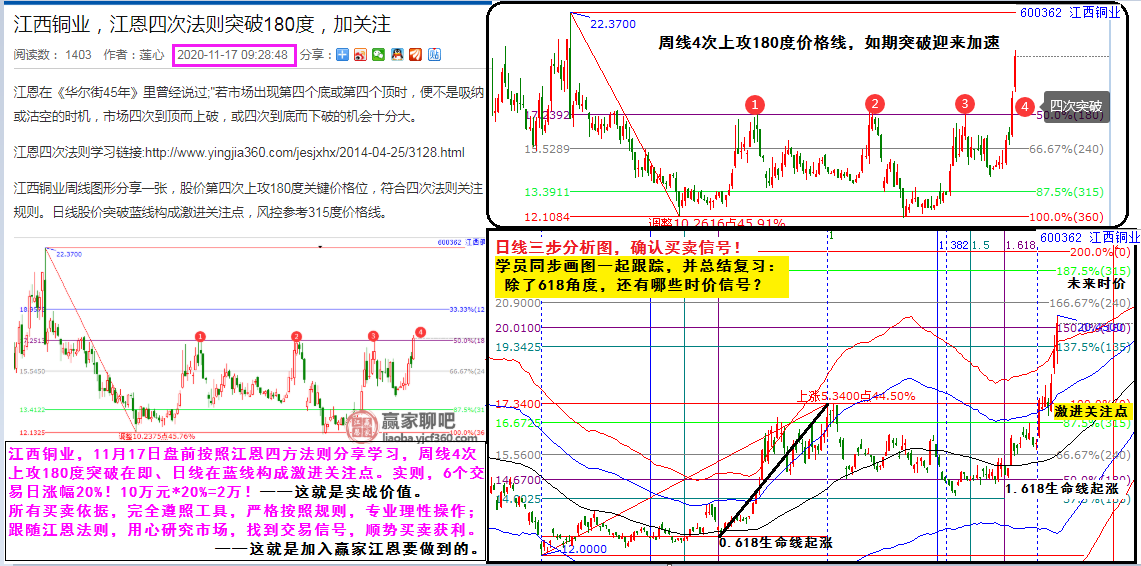 江西銅業,11月17日盤前按照江恩四方法則分享學習,周線4次上攻180度突破在即、日線在藍線構成激進關注點。實則,6個交易日漲幅20%!10萬元*20%=2萬!這就是實戰價值。