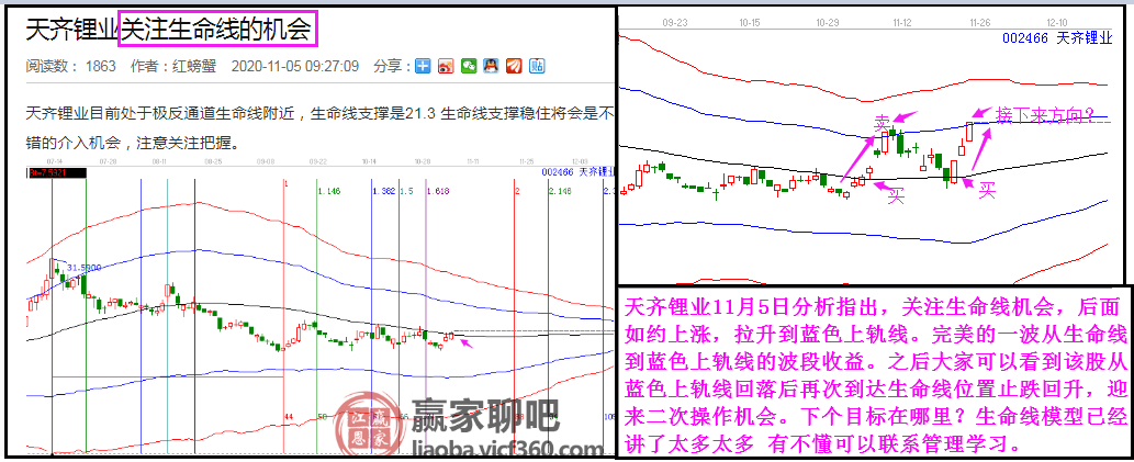 天齊鋰業11月5日分析指出,關注生命線機會,后面如約上漲,拉升到藍色上軌線。完美的一波從生命線到藍色上軌線的波段收益。之后大家可以看到該股從藍色上軌線回落后再次到達生命線位置止跌回升,迎來二次操作機會。下個目標在哪里?生命線模型已經講了太多太多 有不懂可以聯系管理學習。