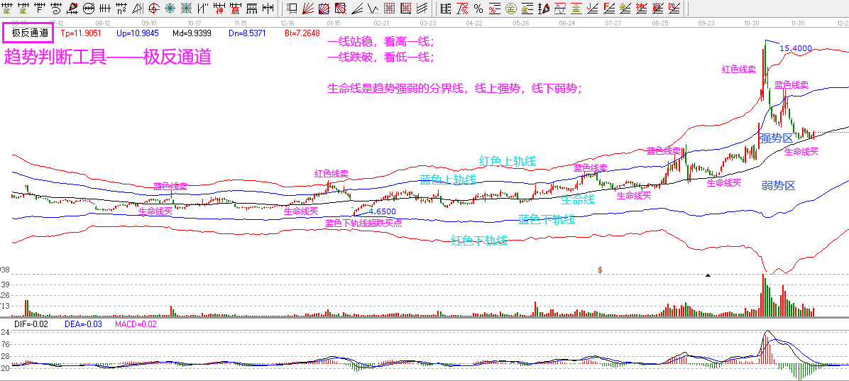 極反通道是在道家物極必反思想的基礎上,融合江恩的經典分割理論,用5條線直觀清晰的展現市場當下的趨勢以及價格的波動空間。具體判斷方法如下:1.判斷趨勢——極反通道中間的黑色線,稱為生命線。依據股價與生命線的關系:股價在生命線以上,則股票強勢可以操作;股價在生命線以下,則股票弱勢暫不考慮。生命線是一個強勢股票的啟動點,所以贏家建議優先考慮生命線附近的股票,有強勢股不做弱勢股。2漲跌空間預判——5條線互為支撐和壓力:一線站穩看高一線,一線受阻(跌破)回調一線。記住:線上支撐,線下壓力。當前股價在線上則為支撐,站穩上漲目標看高一線;當前股價在線下則為壓力,上不去回調空間看低一線。3.買賣點確定——支撐站穩即是買點,壓力過不去則是賣點。
