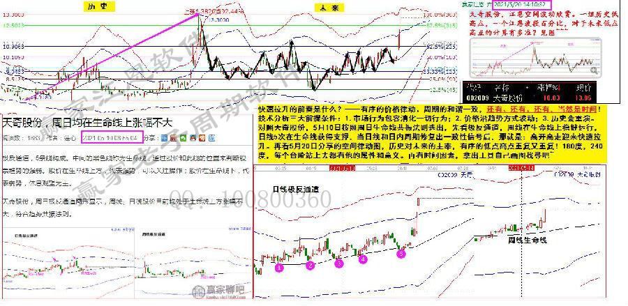 對照天奇股份,5月10日按照周日生命線共振法則選出,先看極反通道,周線在生命線上穩健運行,日線5次在生命線獲得支撐,當日線和日內周期修復出一致性信號后,那就是:高開高走迎來快速拉升。再看5月20日分享的空間律動圖,歷史對未來的主宰,有序的低點高點重復又重復!180度,240度,每個臺階站上去都有他的屬性和意義。再有時間因素,拿出工具自己畫圖找尋吧!