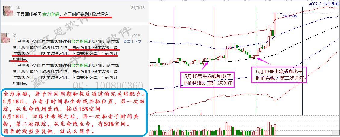 5月18日,老子時價和生命線共振位置,第一次跟蹤,從生命線到藍線,接近15%空間。6月18日,回踩生命線之后,再一次和老子時間周期共振,第二次開始跟蹤,從生命線至今,有50%空間。股不需要多,在于精。好的機會,簡單的模型重復做,操作就是這么簡單。