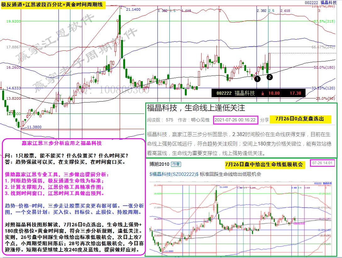 對照福晶科技圖形解讀,7月26日0點選出,生命線上強勢+180度價格位+黃金時間窗,符合三步分析規(guī)則,逢低關(guān)注。實則,26號盤中回踩生命線給出標準低吸機會,次日上攻7個點,小周期受阻回落后;28號再次給出低吸機會,今日喜迎漲停。短期有望繼續(xù)上攻240度及藍線,提前做好應(yīng)對。