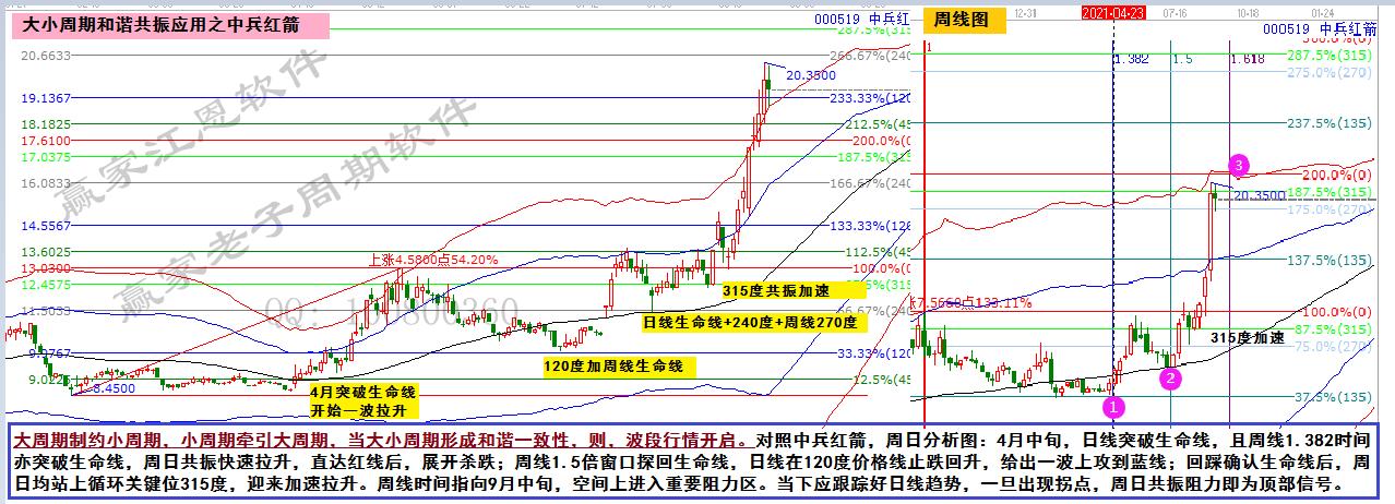 大周期制約小周期,小周期牽引大周期,當大小周期形成和諧一致性,則,波段行情開啟。對照中兵紅箭,周日分析圖:4月中旬,日線突破生命線,且周線1.382時間亦突破生命線,周日共振快速拉升,直達紅線后,展開殺跌;周線1.5倍窗口探回生命線,日線在120度價格線止跌回升,給出一波上攻到藍線;回踩確認生命線后,周日均站上循環關鍵位315度,迎來加速拉升。周線時間指向9月中旬,空間上進入重要阻力區。當下應跟蹤好日線趨勢,一旦出現拐點,周日共振阻力即為頂部信號。