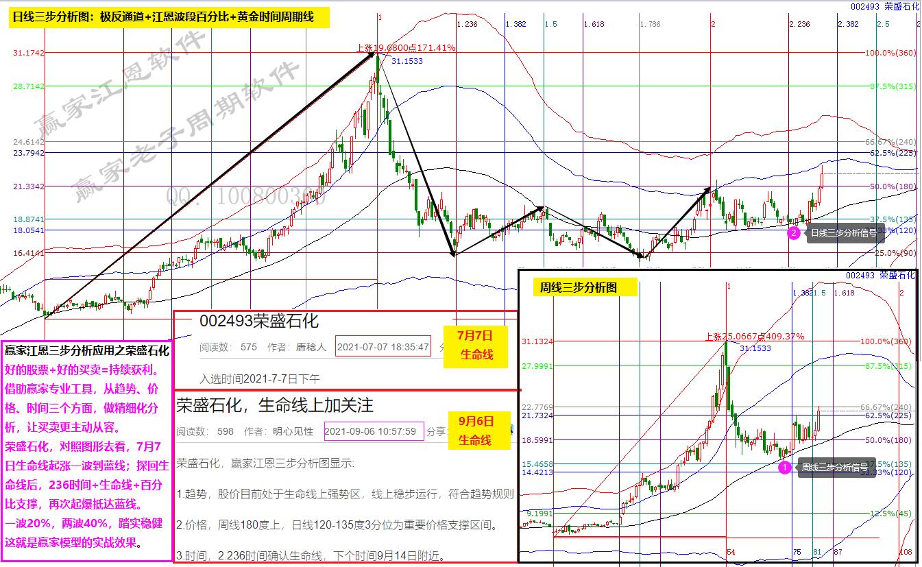 榮盛石化,對照圖形去看,7月7日生命線起漲一波到藍線;探回生命線后,236時間+生命線+百分比支撐,再次起爆抵達藍線。一波20%,兩波40%,踏實穩健這就是贏家模型的實戰效果。