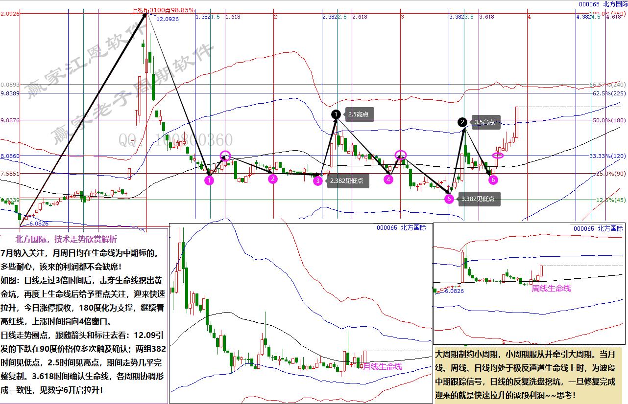 如圖:日線走過3倍時間后,擊穿生命線挖出黃金坑,再度上生命線后給予重點關注,迎來快速拉升,今日漲停報收,180度化為支撐,繼續看高紅線,上漲時間指向4倍窗口?! ?/p>