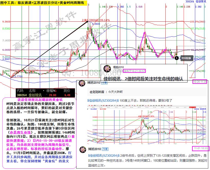 佳創視訊,10月21日強調關注2倍時間后對生命線的確認。如圖:180度壓制,回落生命線洗盤。26號更是跳空低開直接下砸3分位區間(亦是周生命線),按照規則強調2.146時間指向11月3日。抵達支撐區間后觀察兩點1)量能快速萎縮;2)日內5-15-30-60極反通道位置,均殺跌到支撐處則為周期共振信號,止跌反彈在即。標準的挖坑洗盤動作。那么,11月3日時間抵達,開盤就是20CM。打開工具同步畫圖,并對應各周期極反通道位置去看,你會深刻理解“黃金坑”的意義。
