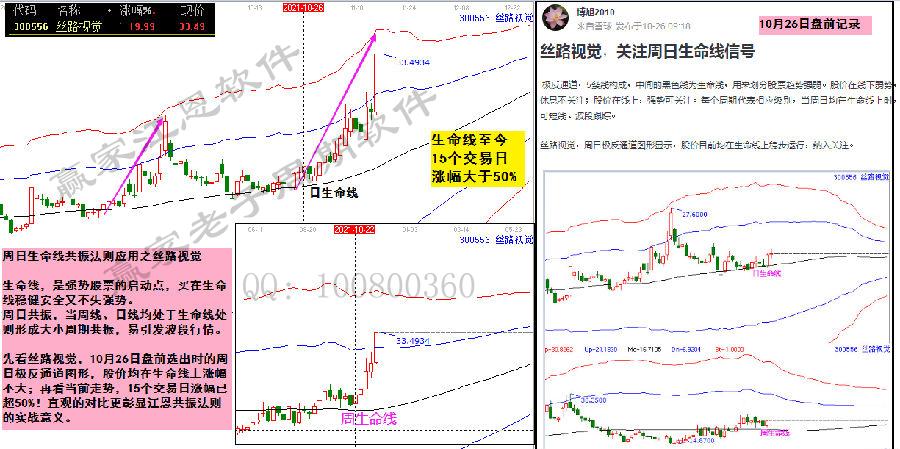 先看絲路視覺,10月26日盤前選出時的周日極反通道圖形,股價均在生命線上漲幅不大;再看當前走勢,15個交易日漲幅已超50%!直觀的對比更彰顯江恩共振法則的實戰意義。