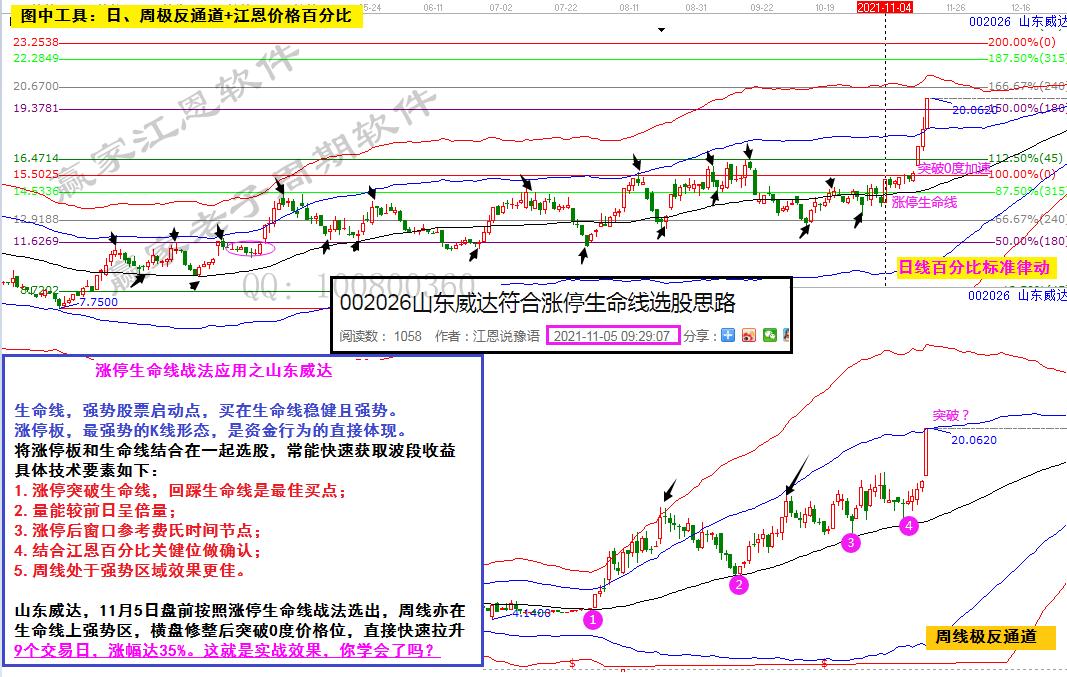 山東威達,11月5日盤前按照漲停生命線戰法選出,周線亦在生命線上強勢區,橫盤修整后突破0度價格位,直接快速拉升。9個交易日,漲幅達35%。這就是實戰效果,你學會了嗎?
