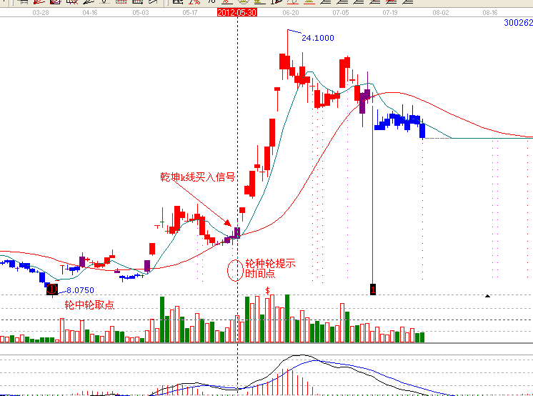 一:首先是趨勢,趨勢工具乾坤k線,依據乾坤k線操作法則,(乾坤k線,有兩條線,關注線,出局線,三種顏色,藍色休息區,紫色關注區,紅色持股區,)300262 , 5月30日再次站上關注線,紫色變紅色,上穿關注線,是加倉或進場的時機。(如下圖)