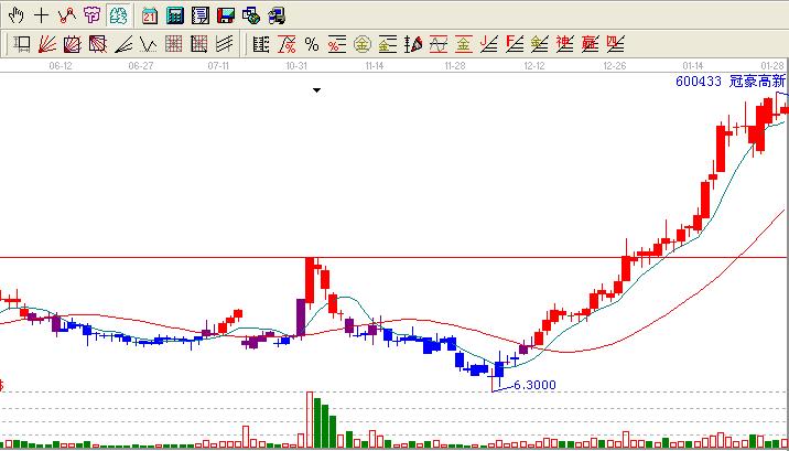 反觀歷史我們會發現蛛絲馬跡:600433在2012-11-01日放量后9.00一路跌倒6.30位置然后開始了10連陽。這個也有人叫做十全十美,一般會走出一波行情,那么600433在走出十全十美之后一直是馬不停蹄緩緩上行,在其2012-12-27日很小的量過了9.00附近的高點創出了歷史新高,這個位置沒有停留多久就再一次新高基本是3天5天一個新高也不理會大盤,就那樣一直橫行無阻的新高著。很多人都發現了這個股票不錯,但是都是啃一口就走掉了,就這樣一直看著他新高。江恩的話在這個案例中再一次發揮的淋漓盡致。也充分的說明了江恩理論在其實戰中的一個地位,就看你是如何理會江恩理論了。