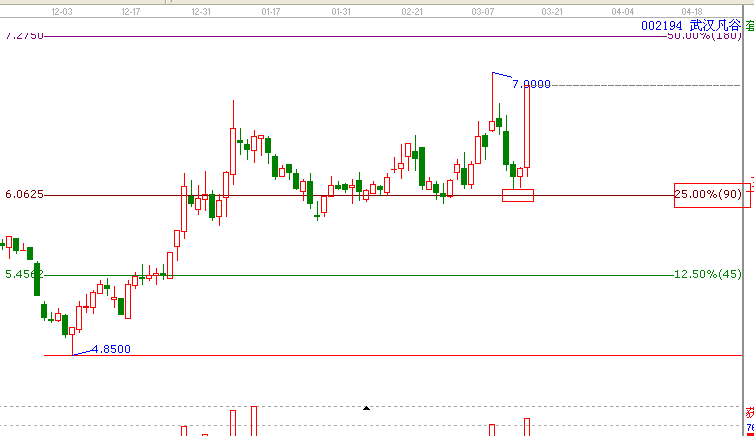 *:江恩價格百分比:依據江恩價格百分比規則,(線上支撐,線下阻力,站穩一線,看高一線 )002194,,13年2月27日低點處于江恩價格百分比的90度的支撐位置,(90度價格6.06元)