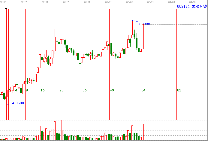 *:平方時間周期線:依據贏家平方時間周期線提示002194的變盤點在3月14日(也就是64周天的變盤日),(這個工具的用法選擇重要的高低點即可,002194的時間起點為12年12月04日的低點。)