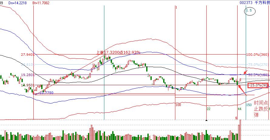2.工具解析:先看極反通道,市場近期一直處于生命線附近,并在其上震蕩整理,按照生命線的操作規則,生命線上強勢區域是可以進場操作的,尤其生命線附近可以買入。價格上,市場多次回落90度支撐,而且,5月11日等距時間窗口該股再次回踩到90度位置,隨后停盤,昨天開盤后回踩到生命線不破,因此判段短期有機會。所以,按照分析,今天就可以低吸買入。買入后生命線不破,即可持股。短期的壓力位就是藍色線,而且,可以看到該位置也是波段百分比180度壓力,是一個價格的共振位。