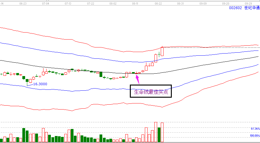 2.在極反通道操作規則中,生命線將個股分為強勢和弱勢兩個區域,當個股處于極反通道生命線上,則為強勢,當個股處于極反通道生命線下,則個股處于弱勢區域。強勢區域個股操作機會多,股性活躍,盈利空間大。而生命線下個股則走勢偏弱,股性也慢,操作風險偏大。因為極反通道就是一個個股能否操作的判斷性工具。也因為簡單直觀,所以能幫使用者更快速的判斷市場,判斷個股,并得出結論。極反通道的五條線均可以是個股的阻力位支撐位,站穩為支撐,破位為阻力。按照江恩的講解,買在支撐位,賣在阻力位,因此,當個股突破站穩生命線的時候,趨勢剛剛轉變,可以看作新的行情的啟動點,生命線就是最佳的買點位置,所以在8月9日個股再次突破并回踩生命線的時候,就形成了新的機會,開始操作。