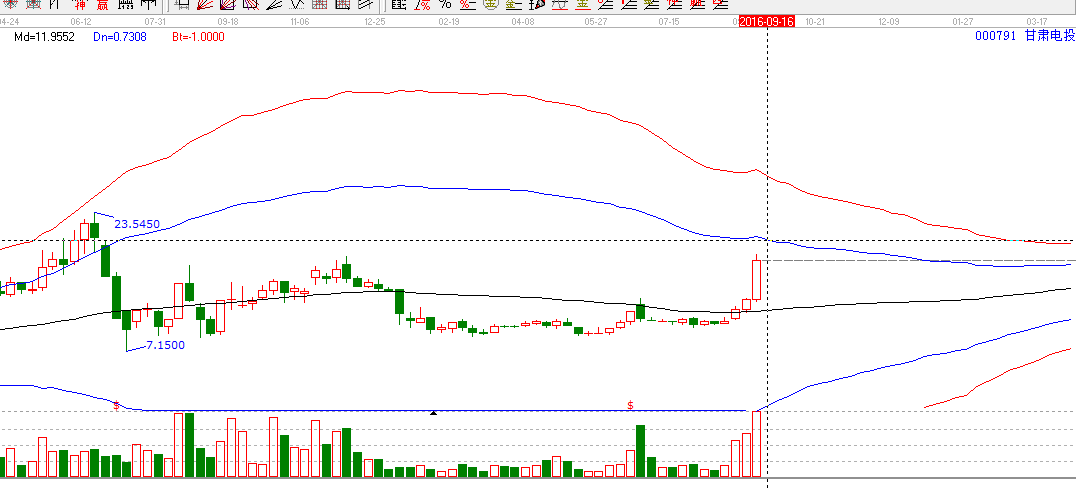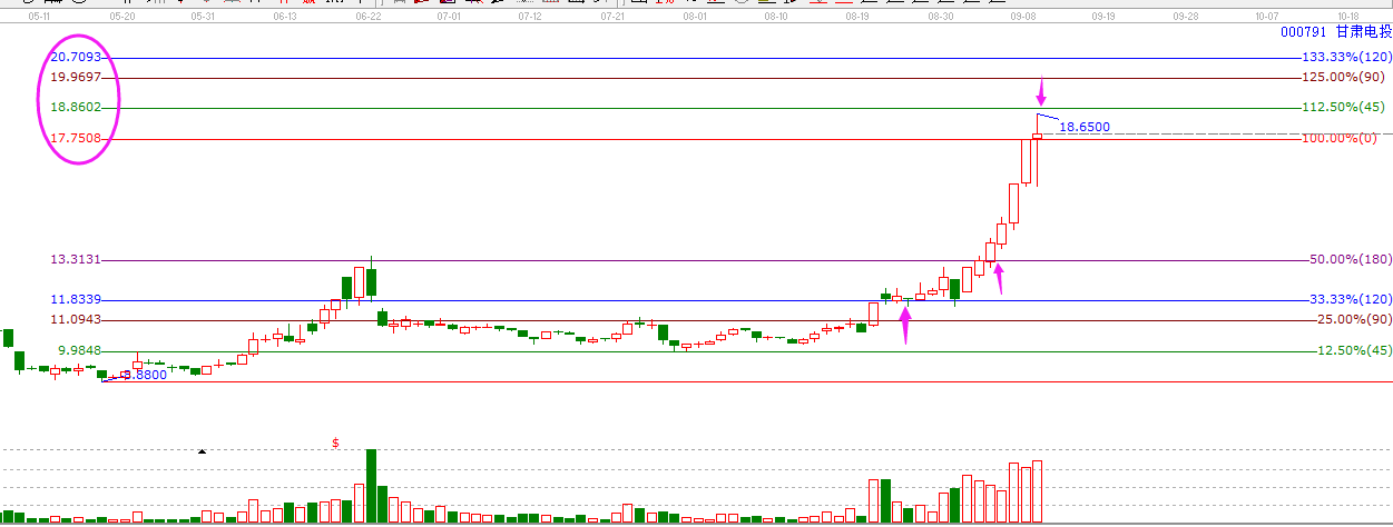江恩圖形分析:江恩價格百分比是我們經常使用的價格分析工具,利用百分比,我們可以很輕松的把握到單邊市場的價格波動空間,阻力位以及支撐位,有效的輔助我們做好持股和交易。買在支撐位,賣在阻力位。突破一線看高一線。按照百分比的操作規則,在8月24日,個股甘肅電投回踩百分比33.33%的支撐位,按照買在支撐位的規則,形成了買點。