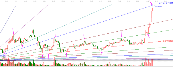 我們以9月2日的低點為起點,計算波動率得到0.0629的波動率值,然后畫上升角度線,得到下面的圖形。可以看到,歷史上重要的高點和低點,均發生在角度線的位置。在角度線中,1*1線上為強勢,1*1線為弱勢,這個股票一直處于1*1線上,處于強勢區域,只要回踩支撐就是最佳的買點位置。歷史也證明了,每次1*1線的位置,都是主升浪行情的啟動位置。8月30日,也剛好是在角度線的支撐位置,有什么理由不操作呢。