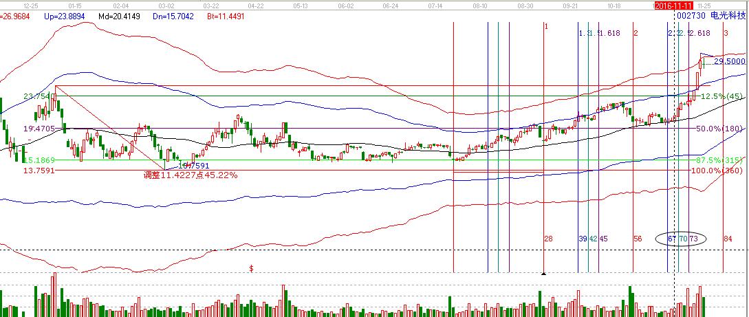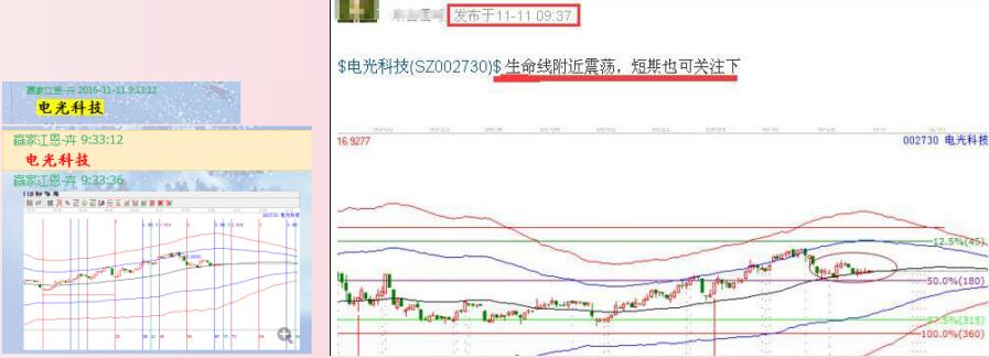 自9月27日市場回踩到2973點附近,此位置是我們強調的時空點,當時市場直接看高到3250點附近,因此,在上漲中的每一次回探都是低吸介入的良機。而大盤在11月9日下踩3100點附近,回踩到60分鐘生命線附近,贏家結合工具提示低吸。電光科技就是在這波調整的時候選出介入的,下面我們具體分析:
