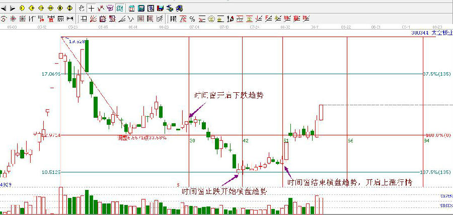 按照上面的理論依據,以及時間和價格的意義,我們做出上圖,時間的意義一目了然。再結合上價格波動,8月1號為時間窗,即將發生趨勢反轉,而價格上也在百分比137.5%價格支撐位,時間窗+價格支撐=買點。因此。8月以來的上漲是預期之內的表現。