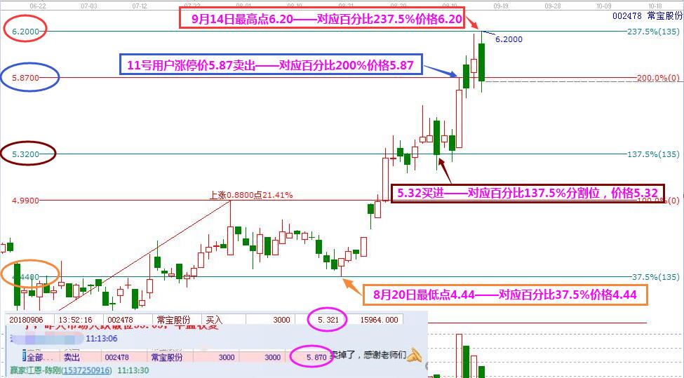 用戶結(jié)合軟件給出的時間以及價格分析,在6號當(dāng)天5.32買進,耐心持股等待,然后個股如期在時間窗11號啟動且盤中拉漲停,按照百分比線站穩(wěn)一線看高一線交易規(guī)則,當(dāng)天137.5%啟動,拉升目標(biāo)位就是200.0%分割位,對應(yīng)價格5.87,再看11號常寶股份漲停最高價剛好就是5.87,點位分毫不差。個股已經(jīng)到達壓力位,用戶在5.87漲停價短線獲利了結(jié),獲利10%+。一個點位精準(zhǔn)可以說是巧合,那我們繼續(xù)看。個股在突破百分比200%分割位之后,下一個上漲目標(biāo)位就是百分比線237.5%分割位,對應(yīng)價格6.20,而14號的最高點恰恰就是6.20,又一次分毫不差。最后我們再看本輪上漲的啟動點位置,個股從前面高點回落之后在百分比37.5%分割位,對應(yīng)價格4.44止跌,繼而開啟一路拉升行情,再回顧8月20日當(dāng)天最低點價格正好是4.44,依然是分毫不差。