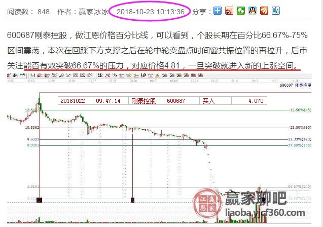 第一波:剛泰控股從17年底就開始了超過70%的大跌。從跌幅上看已經是很驚人的了,從18年9月開始,連續下跌之后,個股在江恩價格百分比75%的位置獲得價格支撐,止跌企穩,開啟持續震蕩整理走勢,從價格上講,符合買在價格支撐操作規則,咱們贏家江恩結合江恩的價格百分比工具與極反通道藍色下軌線共振,用戶于22號提前參與,23號在群中以及贏家江恩聊吧同步發布,在23號當天收獲漲停,24號盤中沖擊漲停,25號再收漲停,三個交易日,累計獲利25%左右。