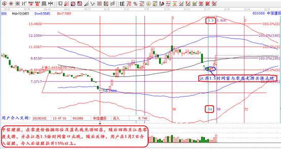 中信建投,在零度價格循環位及藍色線見頂回落,隨后回踩至江恩零度支撐,并在江恩1.5倍時間窗口止跌,隨后反彈,贏家用戶在時間點止跌后1月2日介入,該股短線上漲15%以上。