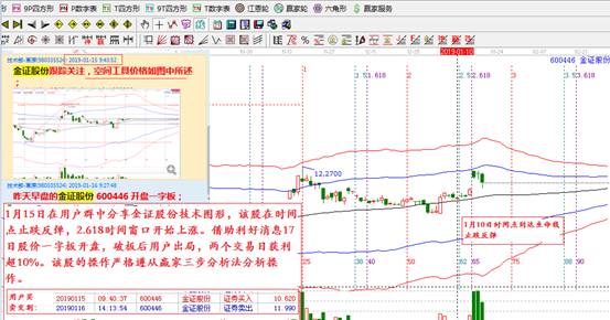 我們看到市場在1月10日江恩2.5倍分割比例這天縮量回踩到生命線不破,短期止跌,股價在 1月15日2.618分割位的時間窗口開始上漲,并在1月17日一字板開盤。1月15日技術部老師在用戶VIP群分享了技術圖形,有用戶介入后,兩天盈利超過十個點。