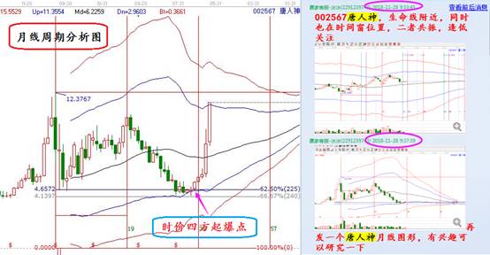 唐人神,贏家江恩股票軟件于11月28日選出,日線周期圖形中,個股處于極反通道生命線支撐,和黃金時間周期線時間窗共振,形成日線的時價共振起爆點;