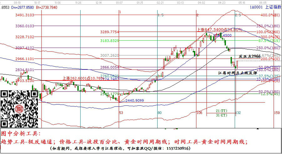 調(diào)整階段,選取的是兩個臨近的高點,從圖中可以看到4月16日時間窗口股價回探到生命線和江恩180度支撐,形成共振,市場轉(zhuǎn)勢向上;4月25日時間窗口股價上攻到極反通道藍色線和江恩315度阻力點,形成共振,股價見頂回落,短期下行。