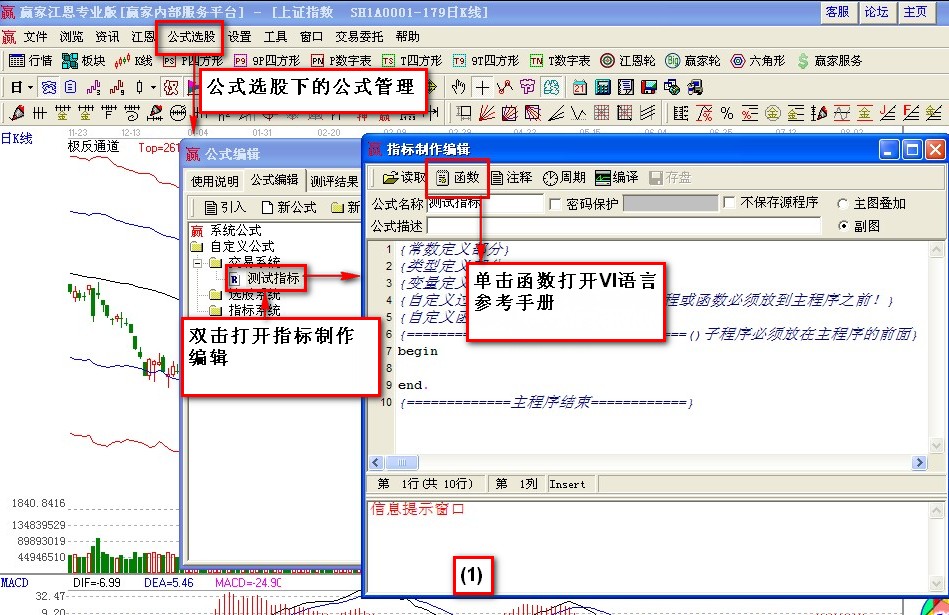 贏家江恩股票軟件函數如何查看?在進入到軟件之后,點擊最上面的一欄中的公式選股,選擇下面的公司管理,雙價打開指標制作編輯,然后在彈出的對話框中單擊函數打開VI語言參考手冊沒然后我們就可以看到顯影的函數區,以及具體的使用說明。當然通過文字不方便大家的記憶,下面就是客服人員為大家整理的相應的圖片步驟,幫助大家的記憶。