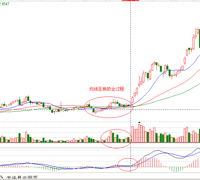 均線高級用法,均線互換,在震蕩中互換均線,不知不覺中完成拉升的前奏,(均線值,13,34,55,)