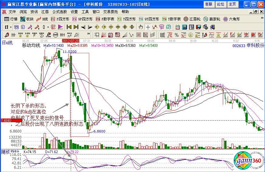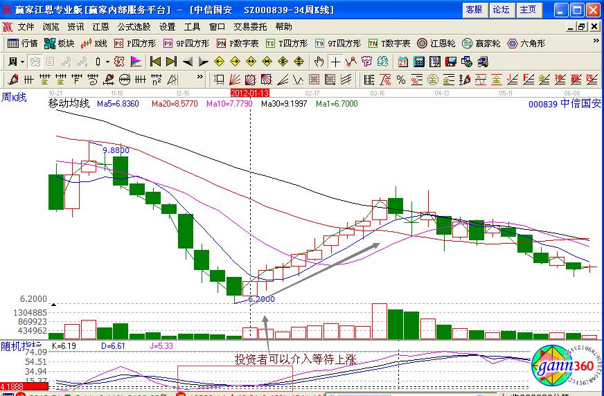 如果感覺對這一則實例的應用不是很熟練,我們可以在觀察一則實例重點分析kdj指標的應用,比如中信國安(000839)的周K線走勢圖,在2011年11月中旬的時候股價在9.87元的位置見頂之后,出現連續的急跌,形成雪崩式下跌形態,是八連陰的K線組合,在出現第6根陰線的時候,其kdj的J值是-0.27,而且連續三周出現的都是負值,而且在第9周的時候,收出陽線,說明多頭開始改變被動的局面,投資者可以考慮逢低介入搶注反彈。